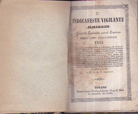 L' Indicafeste Vigilante. Almanacco Geniale Torinese assai curioso per l' anno embolismale 1845 in cui si rinviene l' esatta indicazione di tutte le Feste celebrate in questa Capitale dalle rispettive comunità religiose, collegii, Confraternite, e dalle corporazioni di ciascun' arte e mestiere, e delle Feste principali delle provincie, città, paesi, villaggi e borghi di questi regi Stati; oltre a molte notizie sacre vi si sono aggiunte le Quarant' Ore per tutti i giorni dell' anno secondo. | Libri antichi e moderni | [M. G. A. F.]