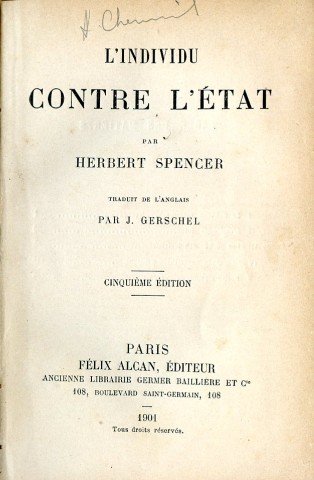 L'individu contre l'État. Traduit de l'anglais par J. Gerschel. Cinquième édition | Libri antichi e moderni | Spencer Herbert