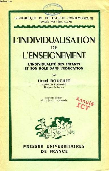 L'INDIVIDUALISATION DE L'ENSEIGNEMENT, L'INDIVIDUALITE DES ENFANTS ET SON ROLE DANS L'EDUCATION | Libri antichi e moderni | Bouchet H.