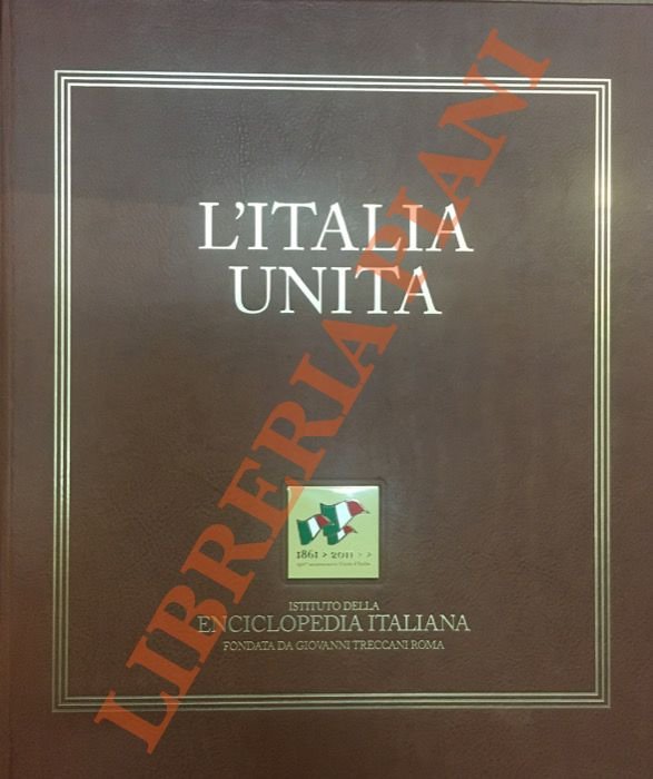 Roma, Istituto della Enciclopedia Italiana, 2011, in-folio, elegante e lussuosa legatura in piena pelle con titoli dorati al piatto anteriore e al dorso, con quattro nervi (legato a mano dalla Legatoria Rigoldi, con pelle di vacchetta conciata in fossa della Conceria 800), placchetta quadrata (logo celebrativo coniato in metallo, smalto a caldo in cinque colori levigato e lucidato interamente a mano, laminato in oro giallo 18 carati, con incisione laser) incastonata al piatto anteriore raffigurante tre bandiere italiane, cofanetto rigido ricoperto della stessa pelle del volume, pp. nn. (350 circa) con 150 illustrazioni fotografiche, in nero e a colori, sempre applicate al recto della pagina. Stampato su carta delle cartiere Fedrigoni. Edizione per il 150° anniversario dell'Unità d'Italia. Dopo le pagine di introduzione, bilingue, di Giorgio Napolitano, il volume si apre con il celebre dipinto del primo Parlamento del Regno d'Italia e procede alla “scoperta” dell'Italia, attraverso una straordinaria galleria di immagini fotografiche che riflettono la memoria storica nazionale e la rendono viva ed eterna, come patrimonio da tramandare alle generazioni future. L'Italia unita documenta in modo impeccabile e puntuale i momenti salienti della nostra storia che si intreccia con la storia del mondo, insieme alle passioni politiche e ai momenti dell'arte, al nostro cinema e alla nostra letteratura. Stato di nuovo.