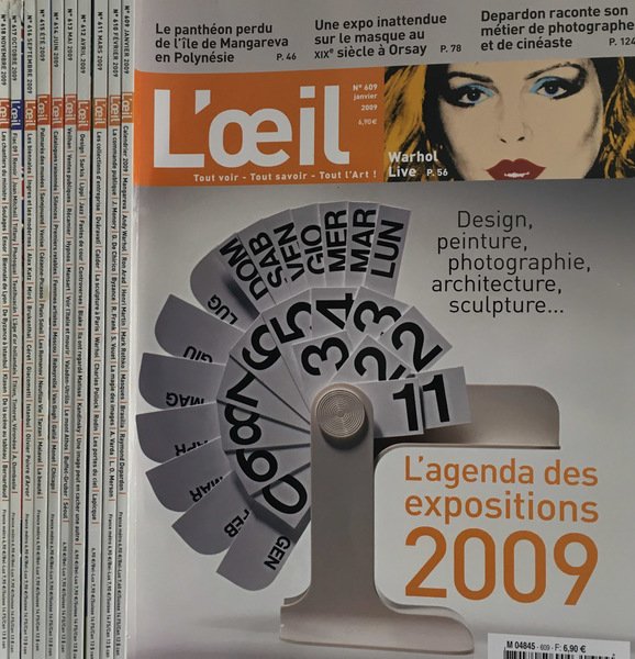 Presenti 11 riviste, NN. da 609 610 611 612 613 614 615 616 617 618 619 2009, del periodico mensile L'Oeil - Tout voir - Tout savoir - Tout l'Art!, fondatori: Georges e Rosamond Bernier, editor e redattore capo: Jean-Christophe Castellain. Ottimo stato, coperta illustrata in cartoncino patinato, qualche segno d'uso, cerniera stretta, pagine, in carta patinata, in ottimo stato. Ogni rivista presenta numerose illustrazioni in b. e n. ed a colori in testo e fuori testo, inserzioni pubblicitarie. Numero Pagine.