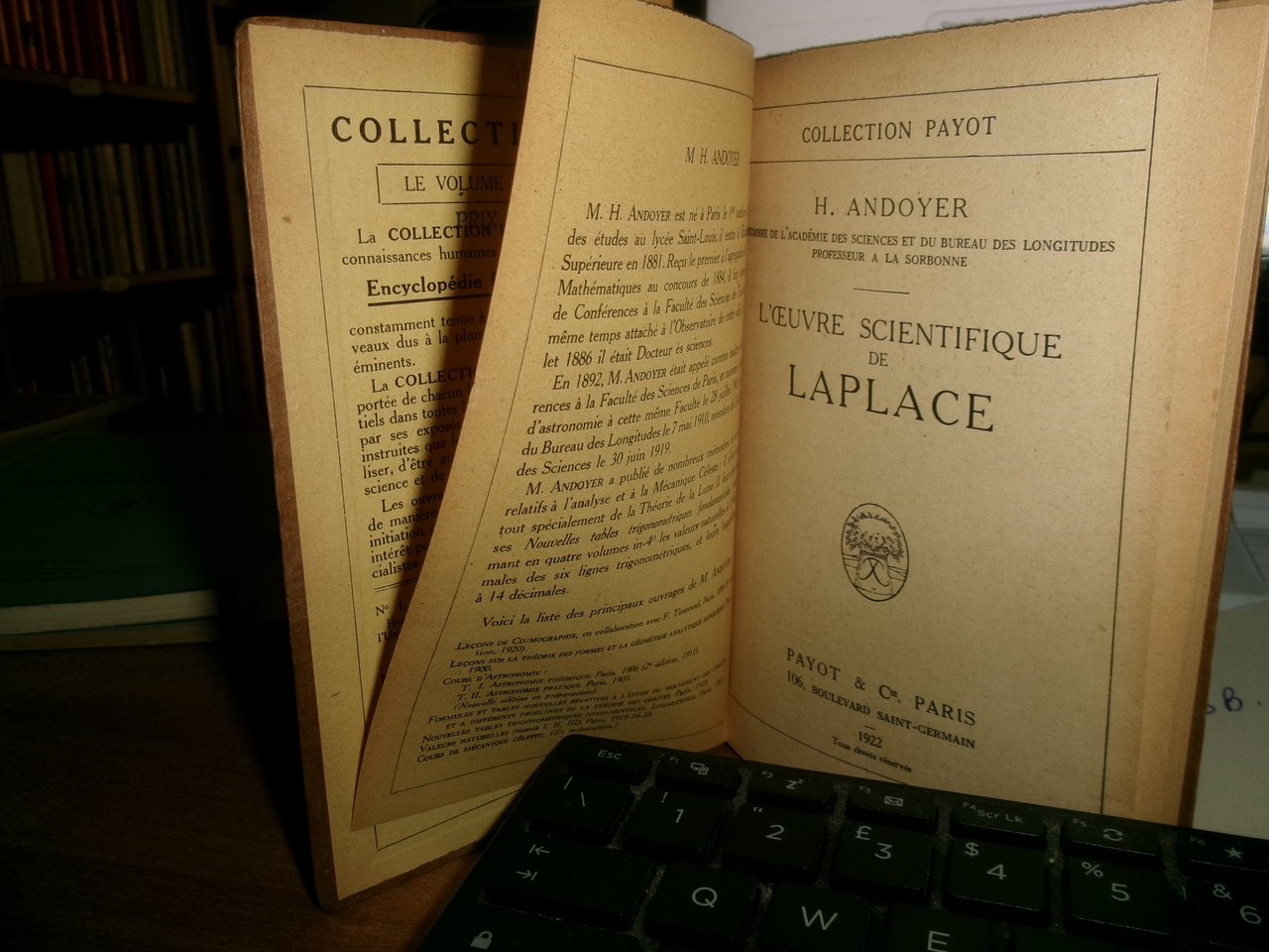 par H. Andoyer. Paris, Payot & Cie, 1922. L' OEUVRE SCIENTIFIQUE de LAPLACE. In-16°, cartoncino edit. orig. 162, (4) pp. Ottimo stato con testo in francese. Neg. med. mob. G