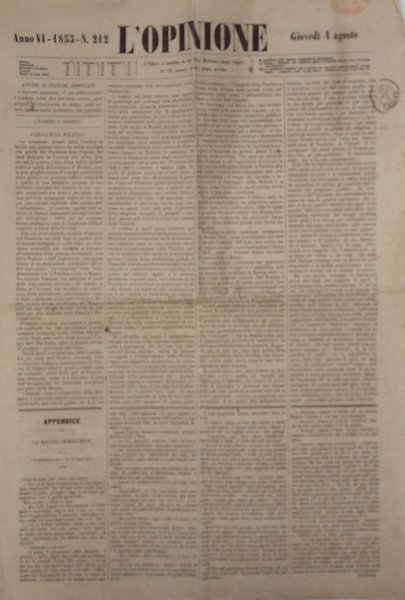 L'opinione, anno Sesto, 1853, numero 212, giovedì 4 agosto. Periodico in buono stato di conservazione, con timbri in copertina e piega. numero pagine nd.