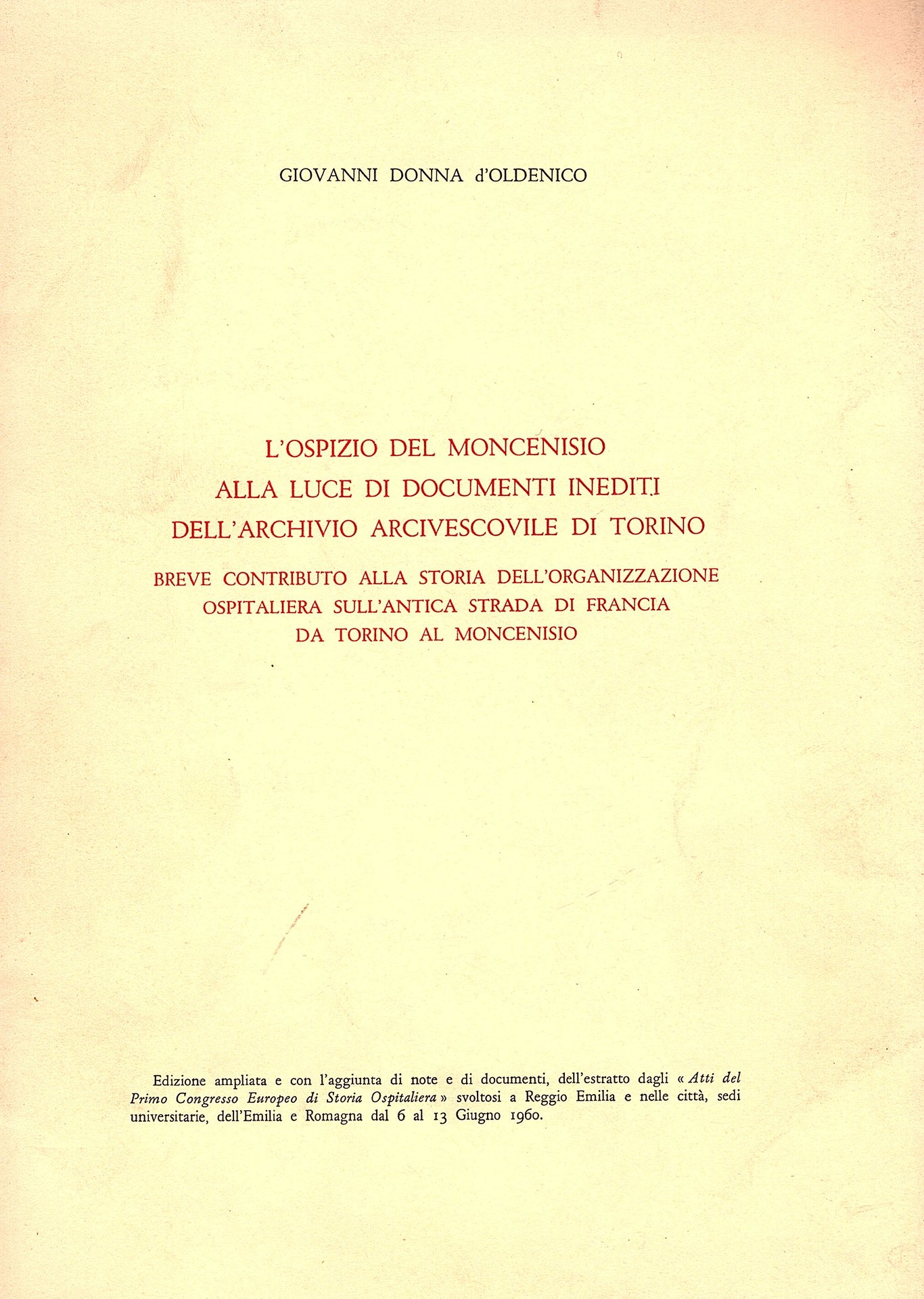 L' ospizio del Moncenisio alla luce di documenti inediti dell'archvio arcivescovile di Torino. Breve contributo alla storia dell'organizzazione ospitaliera sull'antica strada di Francia, da Torino al Moncenisio | Libri antichi e moderni | Donna D'Oldenico Giovanni