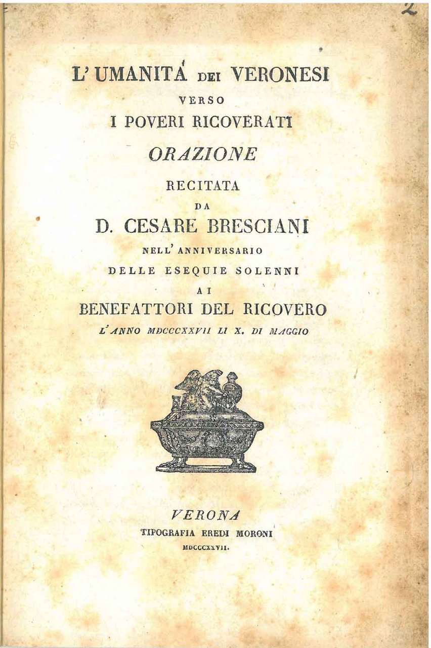 L' umanità dei veronesi verso i poveri ricoverati. Orazione recitata. nell'anniversario delle esequie solenni ai benefattori del ricovero l'anno 1827 li 10 di maggio | Libri antichi e moderni | Bresciani Cesare