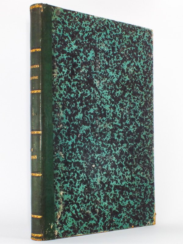 1 vol. in-folio reliure demi-basane verte, ill. noir et blanc, Michel Lévy frères, Paris, 1868, du n° 675 du 21 décembre 1867 au n° 702 du 27 juin 1868, pp. 794 à 818 + tables du S2. de 1867, puis 406 pp. + table des matières et table des gravures du S1 de 1868. Premier semestre seul. Etat satisfaisant (couv. frottée mais solide, lég. rouss. d'usage, mquent pp. 819 et 820 de 1867, état très satisfaisant par ailleurs). Prix en l'état.