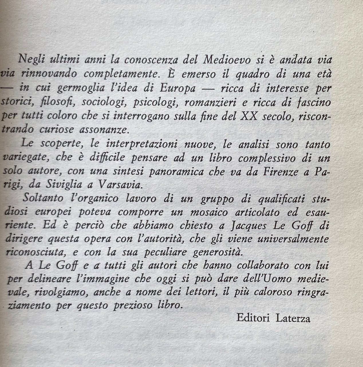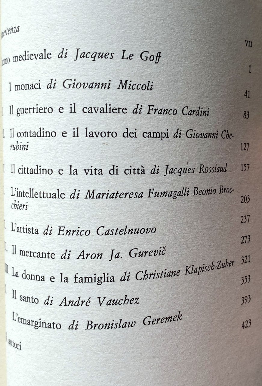 Testi di: Jacques Le Goff, Giovanni Miccoli, Franco Cardini, Giovanni Cherubini, Jacques Rossiaud, Mariateresa Fumagalli Beonio Brocchieri, Enrico Castelnuovo, Aron Ja. Gurevic, Christiane Klapisch-Zuber, André Vauchez, Bronislaw Geremek.