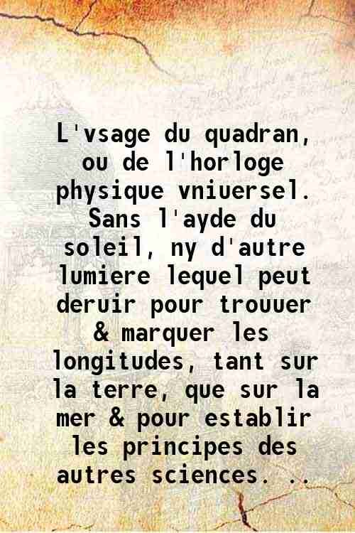 L'vsage du quadran, ou de l'horloge physique vniuersel. Sans l'ayde du soleil, ny d'autre lumiere lequel peut deruir pour trouuer & marquer les longitudes, tant sur la terre, que sur la mer & pour establir les principes des autres sciences. . 1639 | Libri antichi e moderni | Anonymous