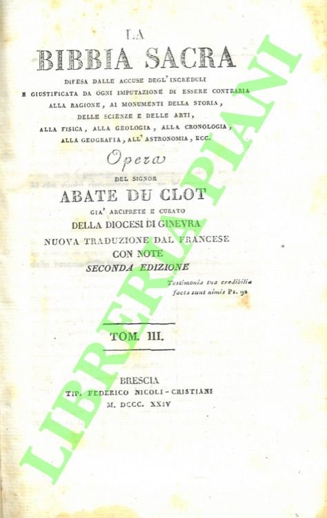 La Bibbia Sacra difesa dalle difesa dalle accuse degl'increduli e giustificata da ogni imputazione di essere contraria alla ragione, ai monumenti della storia, delle scienze e delle arti, alla fisica, alla geologia, alla cronologia, alla geografia, all'astronomia ecc. Seconda edizione. TOMO III. | Libri antichi e moderni | Du Clot, Abate