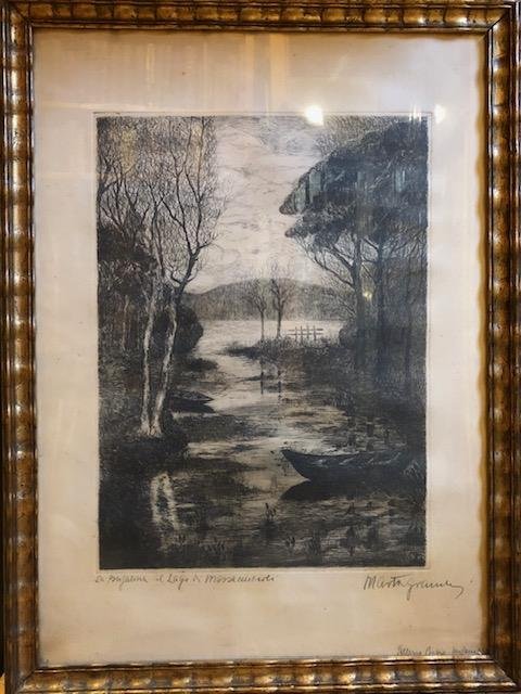 Acquaforte su zinco in formato verticale cm.70x50 (cm.49x36 alla battuta), raffigurante una veduta artistica del falasco sul Lago di Massaciuccoli. Monogramma dell'artista, con la data, impresso all'angolo inferiore destro. Sotto la tavola la notazione a matita, di pugno della pittrice, "La Bufalina al Lago di Massaciuccoli", ed a lato bella firma estesa. In basso a destra, sempre a matita, la notazione manoscritta "Galleria Pesaro - Milano". Sul retro, sempre a matita, altra firma autografa della Granchi, e ancora la notazione "Galleria Pesaro / Marta 1932 - X", con tassello cartaceo a stampa "Visioni pucciniane", parzialmente abraso. Tavola montata in cornice dorata coeva. L'acquaforte fa parte di una serie di quattro soggetti, denominati "Visioni pucciniane" che la pittrice dedicò ai luoghi-simbolo della vita di Giacomo Puccini. Esemplare che fa parte di una tiratura limitatissima di 30 esemplari numerati e firmati dall'Autrice. La pittrice lucchese Marta Granchi (Barga, 1909 - ?) ebbe breve ma intensa carriera, concentrata negli anni '30. Fu proprio nel 1930 che, ancora giovanissima, espose in quella che era al tempo una delle principali gallerie d'arte italiane, la Galleria Pesaro di Milano, centro propulsore delle avanguardie novecentesche e del movimento futurista, la cui attività cessò nel 1937 per il suicidio, a causa delle persecuzioni razziali, del suo fondatore Lino Pesaro. La Granchi espose poi nel 1931 a Firenze, al Parterre San Gallo, e fu di nuovo invitata alla Galleria Pesaro nel 1932, nell'occasione esponendo le sue "Visioni pucciniane", e ancora nel 1935, in occasione della mostra "L'odierna arte del Bianco e Nero", recensita da Raffaele Calzini. Sempre nel 1935 una sua mostra personale a Roma fu positivamente accolta dal celebre critico Francesco Sapori. Si avvicinò progressivamente all'ideologia fascista e ai temi bellici, realizzando nel 1935 alcune tavole per il ventesimo anniversario dell'entrata in guerra, tavole esposte al Circolo della Stampa di Genova che furono poi acquistate dal Comune di Roma, mentre è del 1937 l'acquaforte "Il pericolo è l'asse della vita sublime", conservata al Vittoriale degli Italiani a Gardone. Questo periodo artistico venne così descritto nell'"Almanacco annuario della donna italiana" del 1934: "Marta Granchi nelle sue acqueforti di guerra raggiunge, con la ricerca tecnica della luce, un alto grado di espressione lirica, degno e nobile commento alle zone sacre della nostra guerra". Non tralasciò tuttavia il tema musicale, raffigurando la casa natale di Frederick Chopin, tavola esposta a Ginevra nel 1946 ed oggi facente parte della Collezione Chigi Saracini, la casa natale di Niccolò Paganini e ancora il violinista senese Rinaldo Franci (quadro oggi conservato all'Accademia Chigiana). Alla fine degli anni Trenta si trasferì a Milano, ove risiedette in Via Mengoni. Codice libreria 164679.