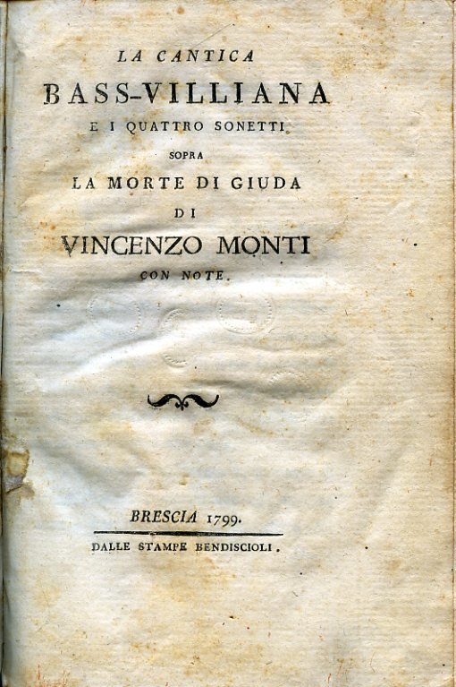 In-8°, pp. 71, legatura ottocentesca m. pelle marrone e angoli con piatti marmorizzati. Aloni e bruniture lievi. Più che discreto esemplare. Rara edizione bresciana (la prima edizione era apparsa a Roma nel 1793) dell'opera montiana più nota dopo la sua classica traduzione dell'Iliade'. Le brevi note poste alla fine dei primi 3 canti non sono quelle delle precedenti edizioni; il sonetto 'Il sogno', a p. 67, figura qui in edizione originale. Il poemetto, scritto in terzine e rimasto incompiuto, è una appassionata esaltazione di Nicolas Joseph Hugou de Bassville, segretario della legazione francese a Napoli, assassinato a Roma il 13 gennaio 1793 a causa delle sue idee filorivoluzionarie; l'evento storico diviene l'occasione per il dispiegarsi di una visione oltremondana di flagrante imitazione dantesca (da cui gli enfatici giudizi dei contemporanei sul Monti come 'Dante redivivo' o 'Dante ingentilito', ripetuti dallo stesso Manzoni, che salutò come erede del 'cuor di Dante'). 'Poema vero, storico, sentito', secondo il giudizio del Carducci, la Bassvilliana fu una delle opere che rimasero sempre care al Monti, tanto che, nei suoi ultimi e commossi versi per la moglie, Teresa Pikler, volle orgogliosamente definirsi 'il cantor di Bassville' ('ti fia vanto il dire: Io fui l'amore / del cantor di Bassville, / del cantor che di care itale note / vestì l'ira d'Achille'). Bustico, 181.