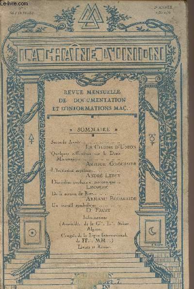 La Chaîne d'Union - n°1, Septembre - 2e année - 1935-1936 - Seconde Année - Quelques réflexions sur le Droit Maçonnique, A. Groussier - L'initiation suprême, A. Lebey - Discipline profane et maçonnique, Lhomme - De la notion de Rite, A. Bédarride | Libri antichi e moderni | Collectif
