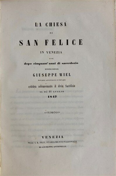 in-8, pp. 30, rileg. mod. tela rigida. Antip. con il ritratto litogr. del pievano Giuseppe Wiel. L'anniversario del sacerdozio è l'occasione per alcuni parrocchiani (Giuseppe Merlo, B. Gerometta e F. Rosada) di divulgare queste notizie storico-artistiche sulla chiesa veneziana di San Felice Nolano, al fine in nota vi è l'elenco dei sacerdoti dalla fondazione nel 1123 con Prospero de Marin fino al Wiel. [298]