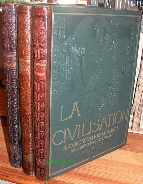 Vol.1: 1faux-titre, 1titre illustré imprimé noir et rouge, 390p., 1feuillet, cartes et nombreuses illustrations en noir in texte, 26 planches (1 double page) dont 12 en couleurs; Vol.2: 1faux-titre, 1titre illustré imprimé noir et rouge, 398p., 1f., nombreuses illustrations en noir in texte, 24 planches dont 17 en couleurs; Vol.3: 1faux-titre, 1titre illustré imprimé noir et rouge, 410p., 1f., nombreuses illustrations en noir in texte, 23 planches (1 double page) dont 15 en couleurs. Bon état. Des premiers hommes à la guerre de 14/18, une histoire de la civilisation et des réflexions de militant pour une meilleure harmonie entre les peuples: ouvrage de Jules GERVAIS COURTELLEMONT (1863-1931), explorateur (grand voyageur en Asie et dans les pays musulmans), journaliste et conférencier, artiste photograveur et praticien de l'autochrome (en rapportant des milliers des pays qu'il visitait) qui fut un des premiers illustrateurs d'ouvrages par la photographie; illustré de photos, dont les célèbres autochromes de l'auteur et de reproductions de gravures et peintures anciennes. Bel exemplaire, en reliure éditeur, bien complet de ses 73 planches dont 44 en couleurs. Reliure éditeur demi-chagrin; dos entièrement ornés à froid, auteur-titre et tomaison dorés; plats de percaline vert sombre en encadrements dorés: les 1ers à l'effigie de la civilisation (femme nue portant flambeau sur fond d'usines et de temples grecs), les seconds ornés en leur centre d'une roue dorée ailée sur une couronne florale à froid; tranches rouges; gardes marbrées.