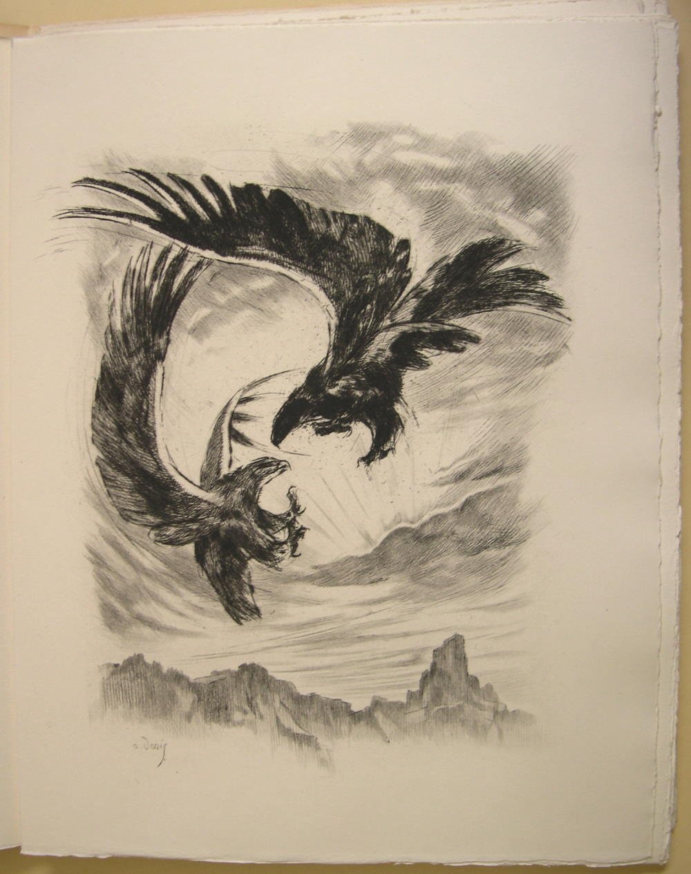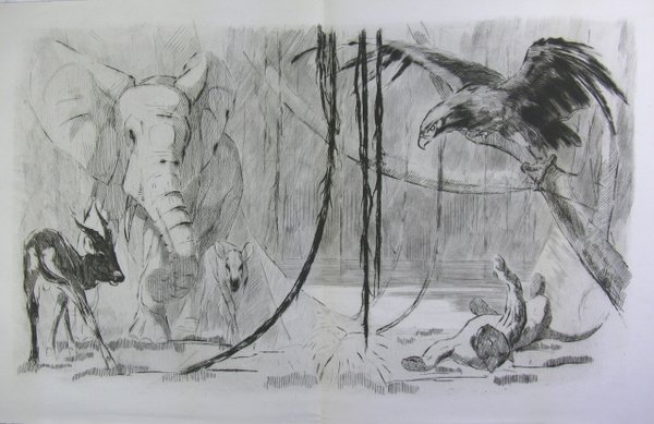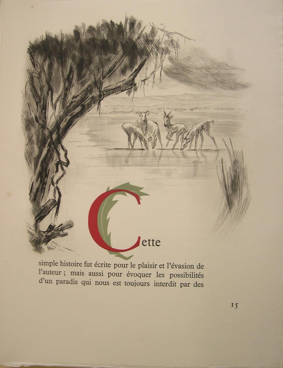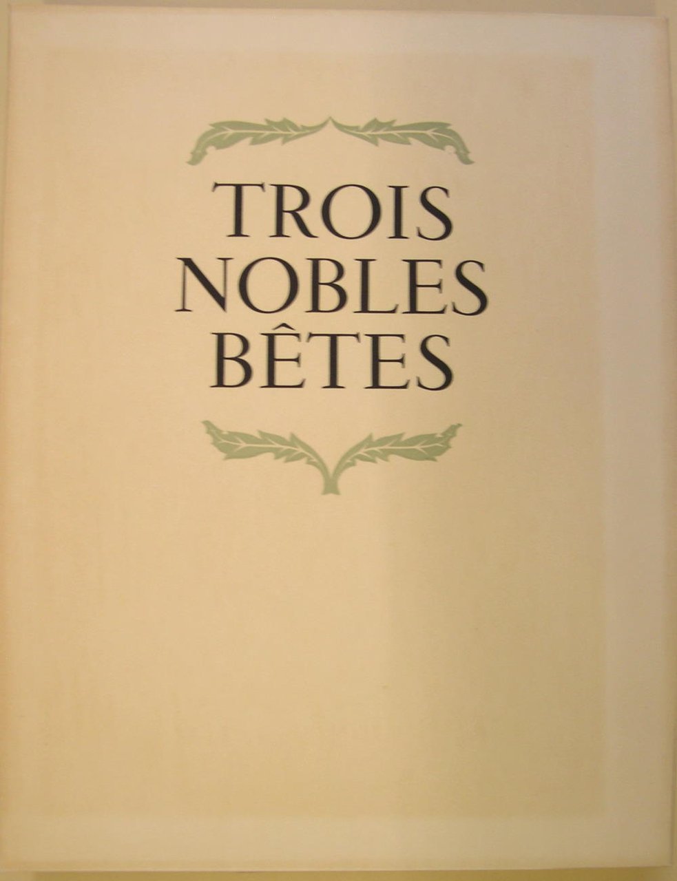 Editions Vialetay, Paris, 1951. In/4 en feuillets, couverture blanche imprimée et rempliée sous chemise et étui recouverts de paille tissée, illustrations : 20 eaux fortes originales en noir de Odette Denis et deux planches supplémentaires, 183 pages. Un des 257 ex. ; celui-ci est un exemplaire d’artiste avec envoi de l’illustratrice. "André Demaison, romancier demeuré presque inconnu, avait collaboré en tant que spécialiste de l'Afrique au 'Guide officiel' de l'Exposition coloniale de 1931. La nécrologie de l'auteur, publiée dans Le Figaro du 21 septembre 1956, dit qu'il avait mené une vie de pionnier en Afrique, Sénégal. Encouragé par les frères écrivains Jean et Jérôme Tharaud, Demaison consignait des récits au sujet de la vie africaine et du monde animal. On sait par contre qu'outre Trois nobles bêtes, Odette Denis a également enrichi de gravures animées les Poèmes barbares (1948) de Lecomte de Lisle et Le livre de la jungle de Rudyard Kipling (1949)." (National Library of the Netherlands) Le présent ouvrage nous montre son talent pour les animaux sauvages. Biblio : Monod 3600.