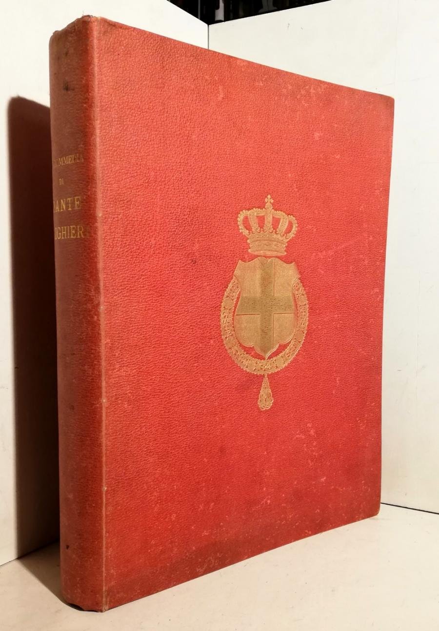 In-folio atlantico (380x280 mm.), pp. XIX, (1), 593, (5). Legatura in piena percallina rossa con stemma sabaudo al centro della campitura del primo piatto. Ottimo esemplare a pieni margini, impresso su carta forte, di questa lussuosa opera, commissionata da Re Umberto I di Savoia e dedicata al Principe Vittorio Emanuele. La lezione che vi si propone è del monferrino Stefano Talice da Ricaldone, commentatore dantesco del Quattrocento rimasto sconosciuto fino al 1885, anno in cui Rodolfo Renier lo riscoprì pubblicando sul 'Giornale storico della letteratura italiana' l'articolo: 'Un commento a Dante del secolo XV inedito e sconosciuto'. La genuinità della lezione taliciana è stata in seguito ridimensionata e circoscritta da più attenti studi filologici, eseguiti soprattutto attraverso la comparazione di questo commento con il ben più noto fatto da Benvenuto da Imola.