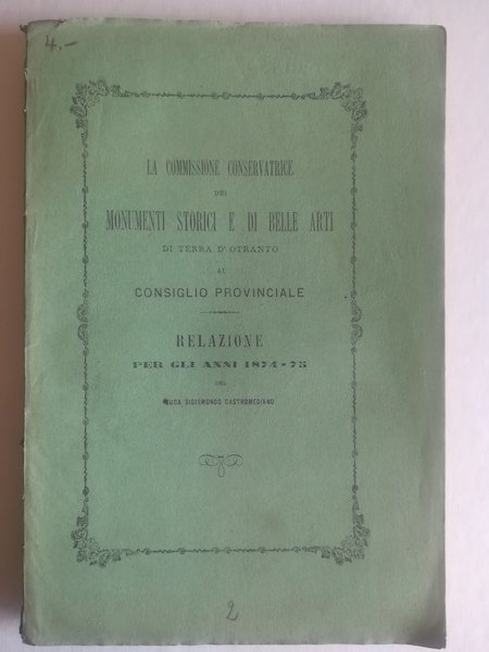 La Commissione conservatrice dei monumenti storici e di belle arti di Terra d'Otranto al Consiglio provinciale. Relazione per gli anni 1874-75 | Libri antichi e moderni | Sigismondo Castromediano