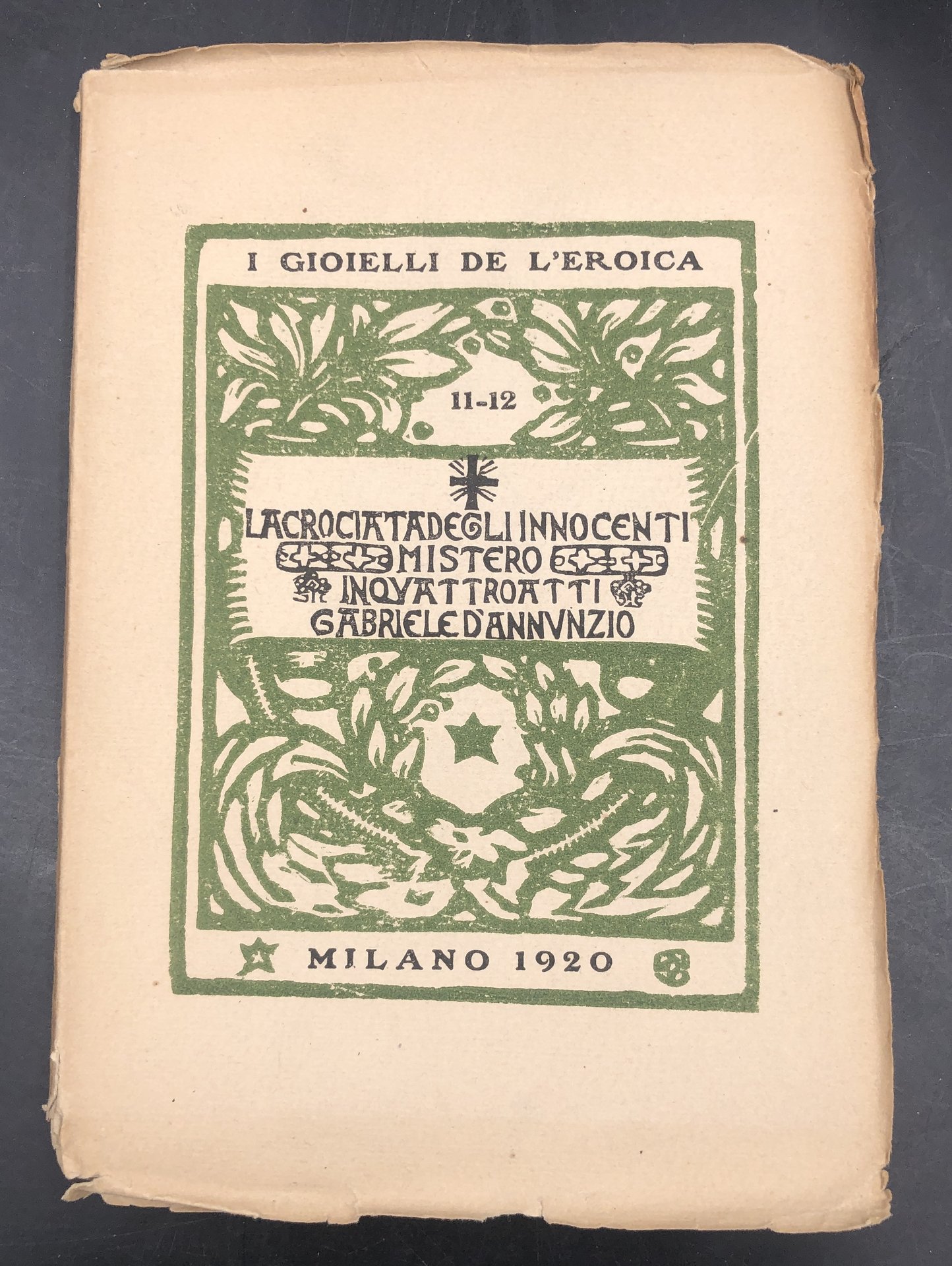 In-16° (cm. 18,6), pp. 86, (8) con 23 XILOGRAFIE in verde (di cui 5 a piena pagina). e con 4 pp. di facsimile di ms. di D'Annunzio. Bross. edit., interno in forte carta di pregio nelle sue barbe. Edizione in parte originale (era uscito in-4° come fasc. de L'Eroica nel 1911). MANTELLI (Genova 1884 - Verona 1918), allievo di Giovanni Fattori, amico di Lorezo Viani. protagonista come xilografo ne L'Eroica del Cozzani, di innovativo linearismo liberty / espressionista.