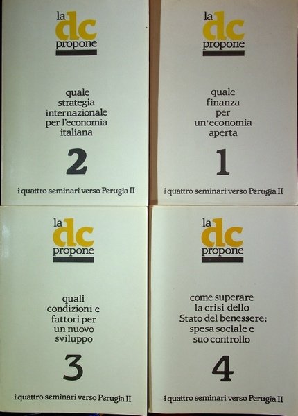 La DC propone: i quattro seminari verso Perugia II: 1. Quale finanza per un'economia aperta: Milano 8 e 9 febbraio 1982; 2. Quale strategia internazionale per l'economia italiana: Bari 8 e 9 marzo 1982; 3. Quali condizioni e fattori per un nuovo sviluppo: Torino 22 e 23 marzo 1982: 4. Come superare la crisi dello Stato del benessere; spesa sociale e suo controllo: Roma 15 e 16 aprile 1982.