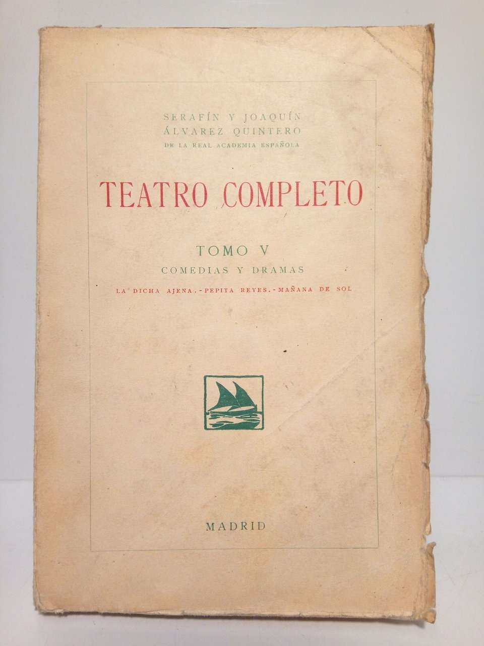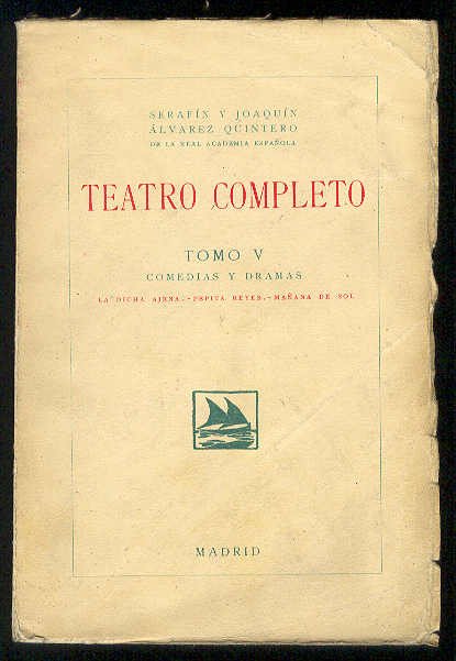 Madrid: Sociedad General Española de Librería (Imp. Clásica Española), 1923.- 258 p., [3 h.]; 8º mayor (19,3 x 13 cm); Margenes integros, conservando sus barbas; Rústica Ed.- (TEATRO COMPLETO. Tomo V. Comedias y Dramas).* Cubiertas ligeramente fatigadas. TEATRO ESPAÑOL DE LOS SIGLOS XIX-XXI