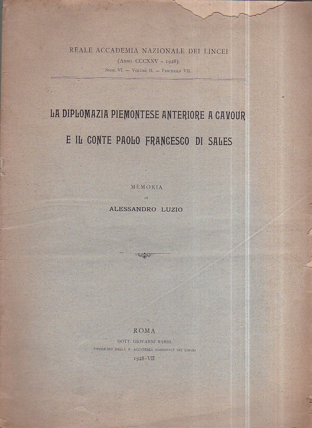 La diplomazia piemontese anteriore a Cavour e il conte Paolo Francesco di Sales. Memoria. Reale Accademia Nazionale dei Lincei (anno CCCXXV - 1928). Serie VI - Volume II - Fascicolo VII | Libri antichi e moderni | Luzio Alessandro