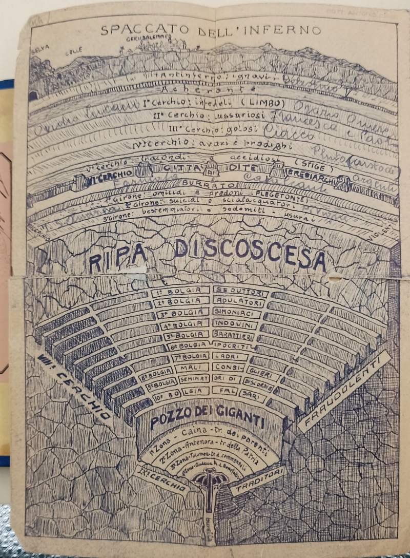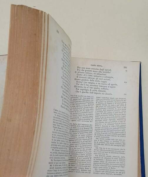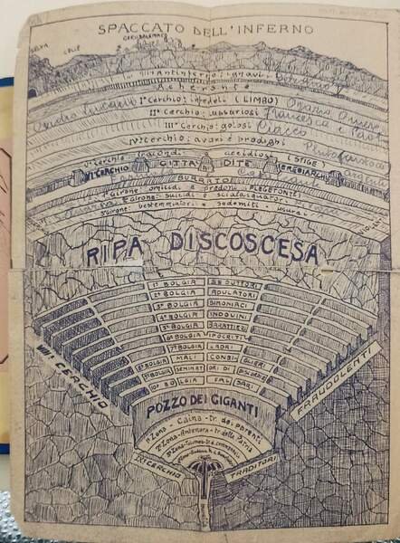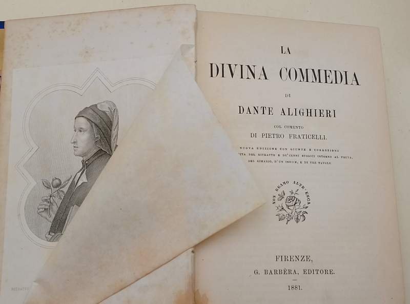 In 8', leg. cart. con tit. in oro al dorso e fregi impr. ai piatti,ritratto di Dante con velina prot. in antiporta, pp. 723+CXXX, tavv. , una rip. all'antiporta del purgatorio e del paradiso; etichetta meritoria di istituto scolastico datato 1883 al contropiattto ant, conservato disegno dello spaccato dell'inferno. col comento di Pietro Fraticelli nuova edizione con giunte e correzioni arricchita del ritratto e de' cenni storici intorno al poeta, del rimario, d'un indice, e di tre tavole. rottura della legatura nella parte ant.(foto), interni in buono stato, fioriture e segni del tempo. ***Due to bureaucratic reasons, books dated over 70 years old cannot be immediately exported, please contact us before placing the order.***