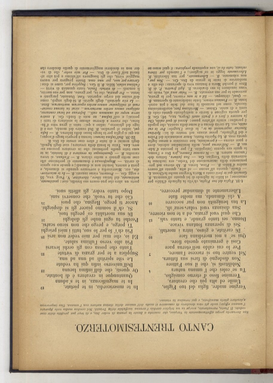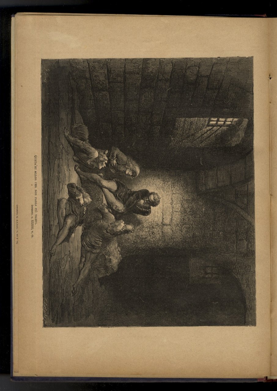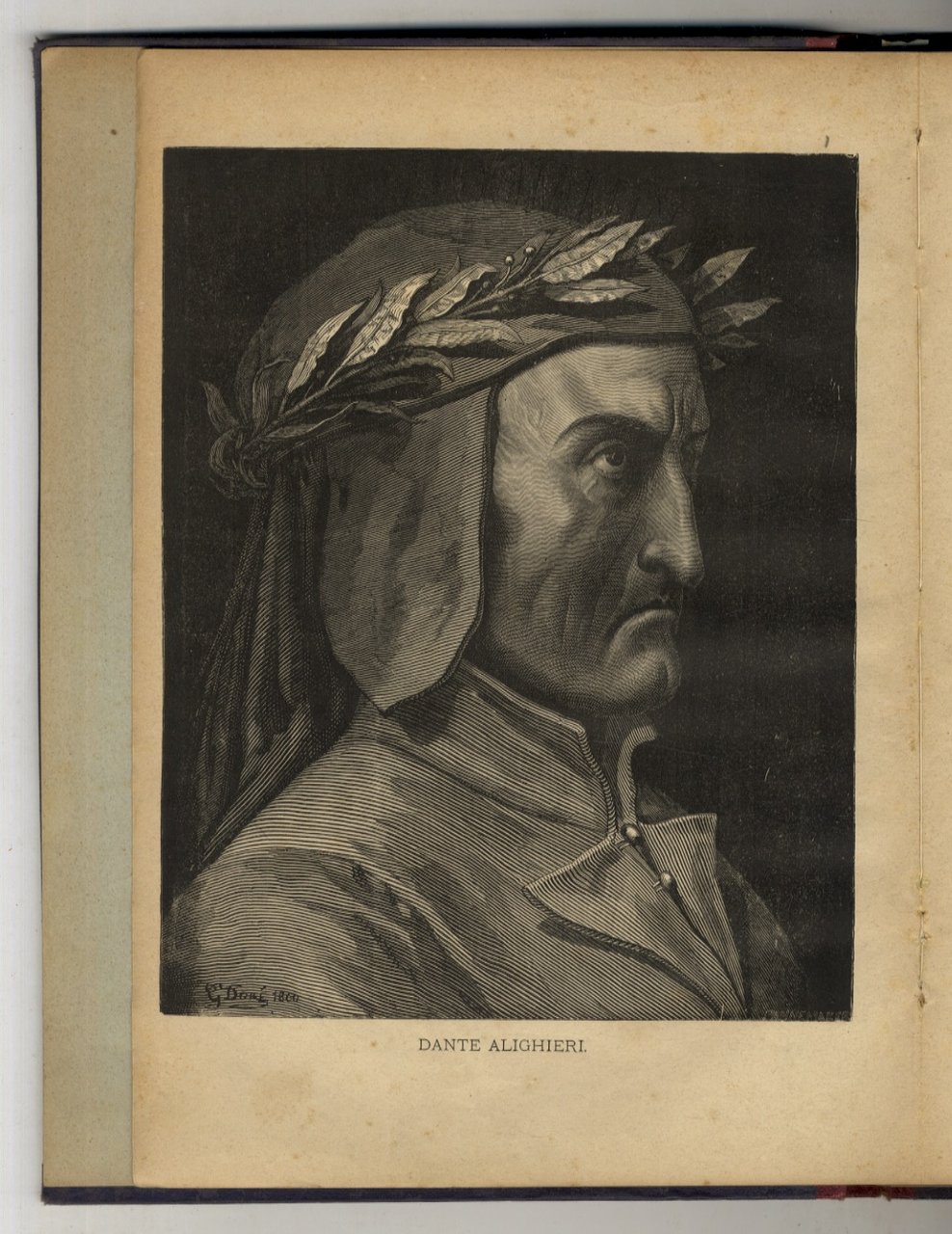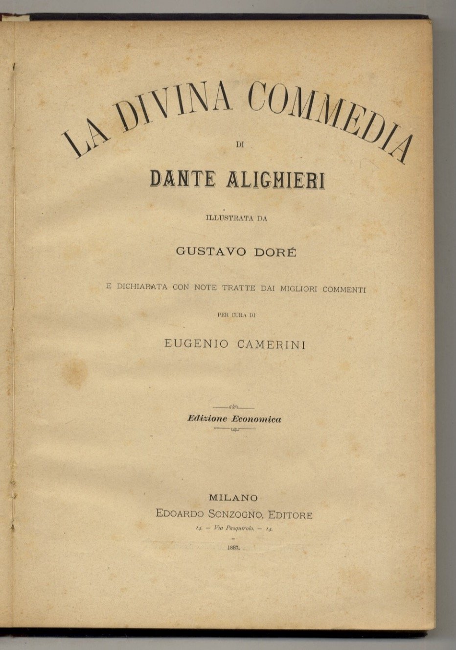 Milano, Edoardo Sonzogno Editore, 1887, un volume diviso in tre tomi, in-4, legatura di poco successiva in mezza tela muta, pp. [8], 679, [1]. Con ritratto di Dante in antiporta e 135 illustrazioni di Doré, tutte a piena pagina. Una illustrazione dell'Inferno con strappo riparato.