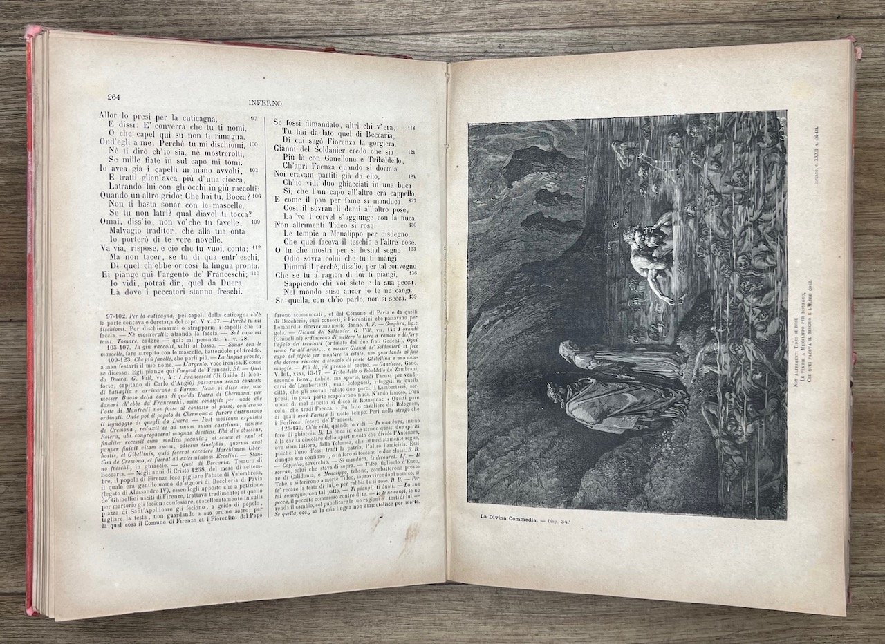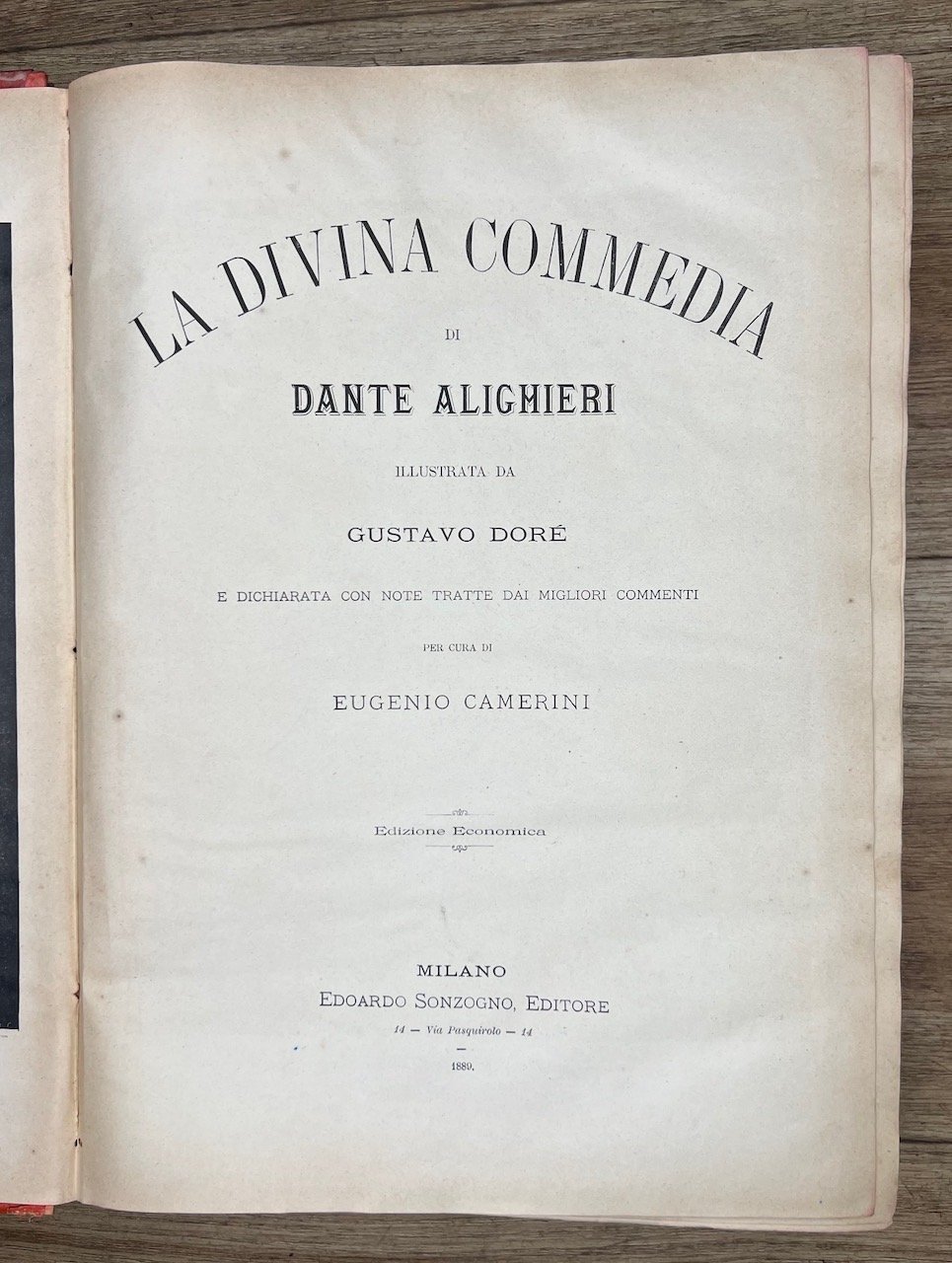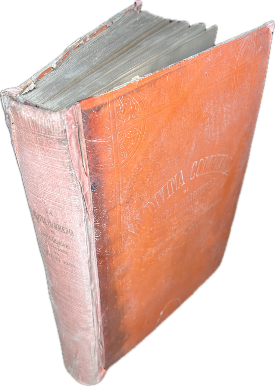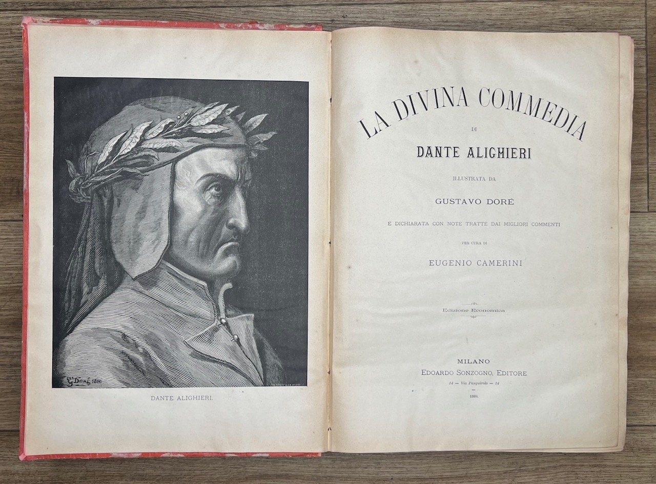 Milano, Edoardo Sonzogno Editore, 1889, in-4, legatura editoriale in piena tela rossa, pp. [8], 679, [1]. Con ritratto di Dante in antiporta e 135 illustrazioni di Doré, tutte a piena pagina. Esemplare non brillante: sbiaditure alle copertine e al dorso, gore e ondulazioni da umidità alle prime e alle ultime carte.