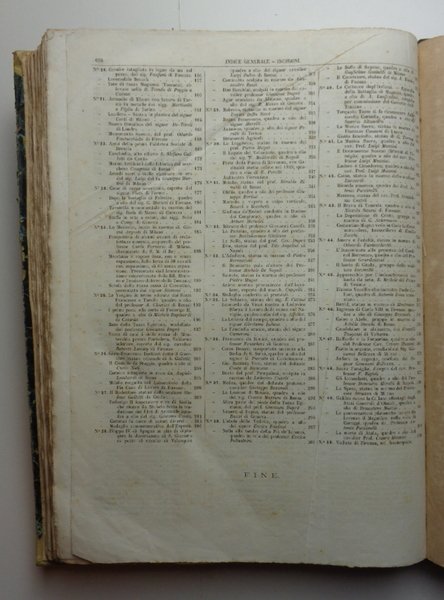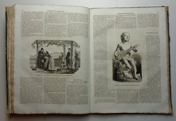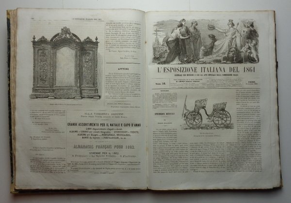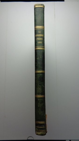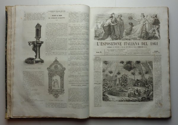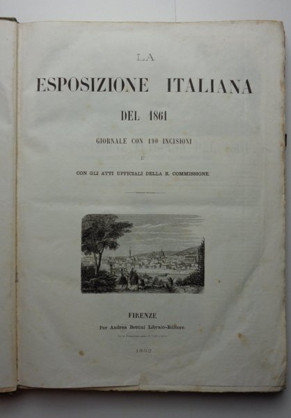 Un volume (27x37 cm) di (4)-396 pagine, con numerose incisioni. Veduta di Firenze al frontespizio. 50 numeri (l'ultimo di indice) del Giornale della Esposizione, con testata sormontata da incisione con l'Italia che corona le arti produttrici. Tutto il pubblicato. Molto raro esemplare in ottimo stato di conservazione. Legatura coeva in mezza pelle verde con titolo dorato al dorso e piatti marmorizzati, qualche usura alle cerniere e agli angoli. La prima Esposizione dell'Italia unita (sul primo numero la figura di Vittorio Emanuele II, Re d'Italia). La realizzazione di quellimpegnativo evento fiorentino fu affidata, con decreto reale, ad una Commissione di 28 membri alla cui presidenza fu nominato Cosimo Ridolfi, Presidente della Accademia dei Georgofili. Con alacre impegno furono eseguiti i lavori per realizzare la cittadella espositiva (112 mila m2), nell'area della storica stazione ferroviaria "Leopolda" (Porta al Prato) non appena quella stazione fu trasferita a Santa Maria Novella. L'Esposizione fu inaugurata da Re Vittorio Emanuele il 15 settembre 1861 e rimase aperta fino all8 dicembre. Ebbe un grande successo, anche perché animata da un generale impegno, con la forza dello spirito risorgimentale e la voglia di misurare le capacità della nascente Nazione (Georgofili.info). Vedi: Danilo Barsanti, Rivista Storica dell'Agricoltura, giugno 2013.