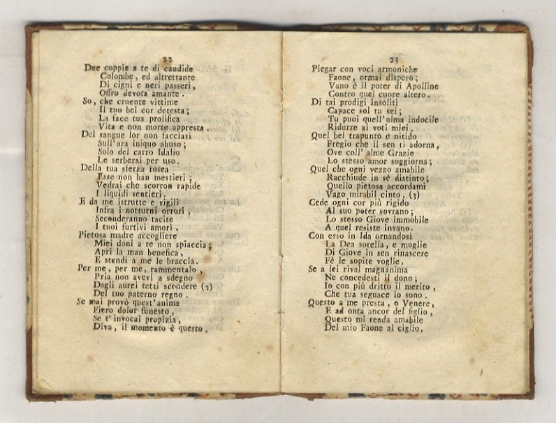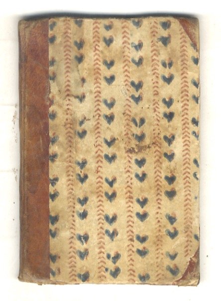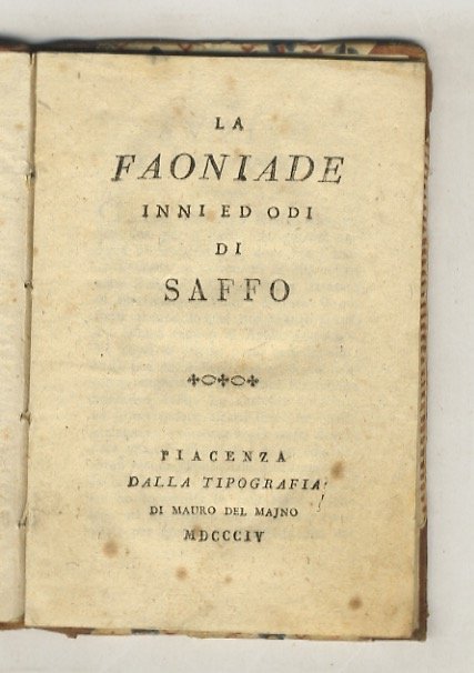Piacenza, dalla tipografia di Mauro del Majno, 1804, in-8, graziosa legatura coeva in mezza pelle ed angoli con piatti in cartone decorato in bicromia con motivo di cuori blu e punte rosse di freccia alternate in file verticali parallele, pp. 47, (1). Questa raccolta poetica attribuita a Saffo si apre con un avviso di anonimo, in realtà l'autore medesimo Vincenzo Maria Imperiali (vedi: G.Melzi, Diz. di op. an. e pseud. vol. I, p. 395). Ottime condizioni, salvo blande tracce d'uso alla coperta e rade fioriture.