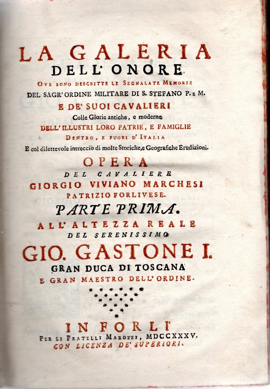 La Galeria dell'onore ove sono descritte le segnalate memorie del sagr'Ordine Militare di S. Stefano [...]. Parte prima (-seconda). | Libri antichi e moderni | Marchesi Giorgio Viviano, ,Marchesi Giorgio Viviano
