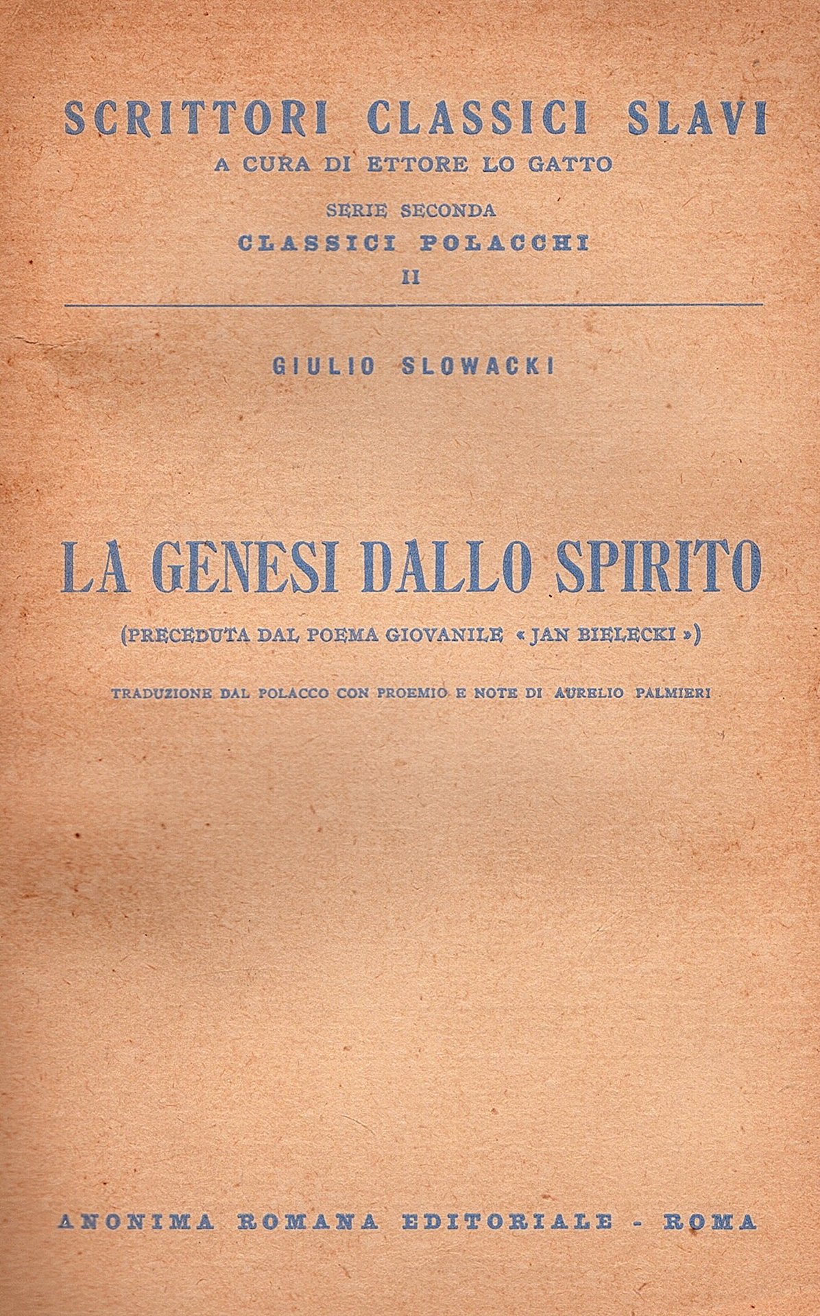 In-8° (18.5x12 cm), brossura editoriale con titoli azzurri al dorso e al piatto anteriore. Pp 107, (3). Collana 'Scrittori classici slavi a cura di Ettore lo Gatto. Serie seconda: classici polacchi, II'. Traduzione dal polacco con proemio e note di Aurelio Palmieri. Ottimo esemplare. Non comune edizione italiana di due prose poetiche del bardo romantico polacco Juliusz Slowacki (1809-1849).