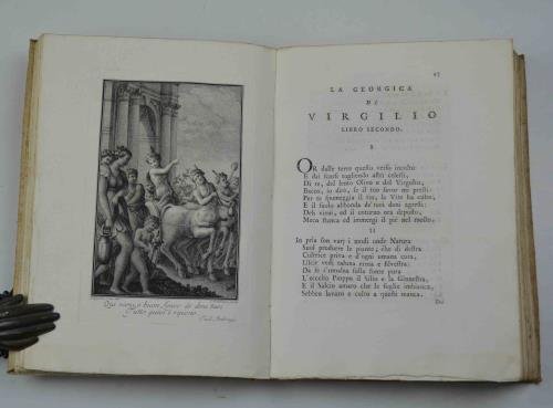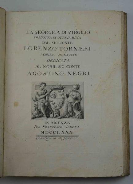 Cm. 26, pp. (2) 168. Vignetta al centro del frontespizio con blasone del dedicatario, il Conte Agostino Negri. Quattro belle tavole f.t. incise in rame da Cristoforo Dall'Acqua. Legatura coeva in cart. alla rustica con dorso anticamete ricoperto in pergamena. Titoli ms. Una piccola gora chiara limitata a poche carte preliminari, peraltro esemplare particolarmente genuino e marginoso (a fogli chiusi) e stampato su carta forte. Elegante edizione vicentina del volgarizzamento del Tornieri (1751-1834) delle "Georgiche", inclusa dal Morazzoni nel suo repertorio sui figurati veneziani del '700, ancorché impressa a Vicenza. Morazzoni, p. 171: "C. Dall’Acqua è a disposizione degli stampatori F. Modena e Turra di Vicenza e prepara loro tavole, testate e finali, che per il concorso di D. Rossi e A. Vecchia possono essere citati come documento della penetrazione neoclassica nel Veneto. I libri di questi due stampatori, parchi di testate e amanti delle tavole a piene pagine, molto si avvicinano a quelli del veneziano Palese: si vegga la Georgica di Virgilio tradotta da Lorenzo Nieri [sic]". Mambelli, 964. Gamba, 2497.