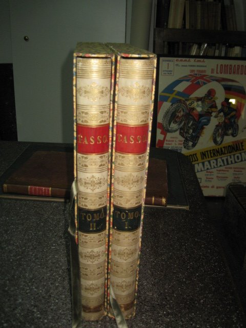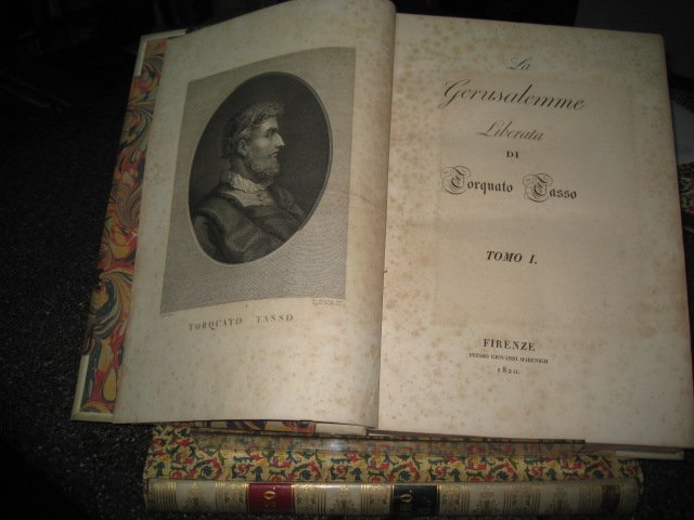 2 volumi in-folio (454x305mm), pp. (6), XXIV, 331; 352; solida legatura primonovecentesca m. pergamena e angoli con titolo in oro su doppio tassello bicromo, filetti e fregi ornamentali in oro ai dorsi. Piatti, tagli e sguardie marmorizzate policrome. 22 tavole complessive incise su rame f.t. da Raffaello Morghen, da Giuseppe Calendi, da Giovanni Scotto e dal Migliavacca da disegno di Gaspare Martellini e L. Sabatelli, di cui 2 sono ritratti (uno del Tasso e l'altro del dedicatario, il principe Nicola Esterhazy di Galanta) e le restanti 20 sono scene ispirate al poema tassiano. Fioriture normali ma magnifico esemplare a pieni margini conservato entro custodie in cartone decorato. Ex-libris xilografico del grande geografo Roberto Almagià. Nell'edizione il poema è preceduto da una vita del Tasso di Lorenzo Crasso, da un'orazione in lode del Tasso fatta all'Accademia degli Alterati da Lorenzo Giacomini Tebalducci Malespini, da una lettera del Metastasio a un amico contenente un raffronto fra l'Ariosto e il Tasso. Brunet, V, 668. Graesse, VI, 34: 'Magnifique edition'. Gamba, 960: 'Fra quelle [edizioni] che hanno ottenuto maggior fama per lusso tipografico'.