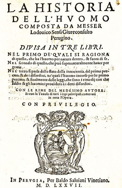 La Historia dell'Huomo. divisa in tre libri: Nel primo si ragiona di quello che ha per natura dentro and fuora di se. Nel secondo .che può sopranaturallmete havere per gratia.Nel terzo si parla | Libri antichi e moderni | Sensi, Lodovico.