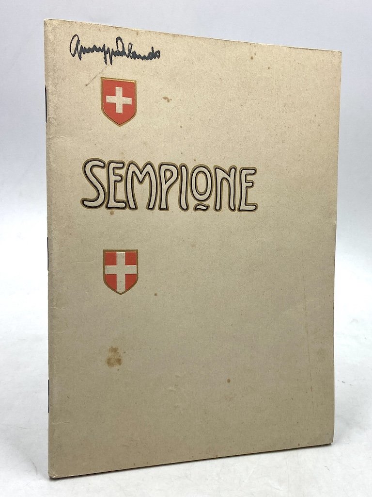 Brossura spillata con titoli in rosso e oro a sbalzo sul piatto anteriore, stemma delle Ferrovie Federali sul posteriore, cm 21x15, pp 55 (1) con numerose illustrazioni in nero e una carta ripiegata a colori in fine. Testo in italiano, tradotto da Alfredo Pioda, con numerose immagini in nero (Fot. Wehrli) di paesaggi delle zone attraversate; in apertura alcune notizie storiche e tecniche sulla realizzazione del traforo, con fotografie di Calzolari e Ferrario. Firma su frontespizio e piatto anteriore, timbretto di collocazione al primo contropiatto. La carta a colori in scala 1:450000 rappresenta la zona dal lago Lemano alla parte settentrionale del Lago Maggiore, col tracciato ferroviario indicato in rosso (Losanan- Domodossola); la carta è firmata H. Kummerly.