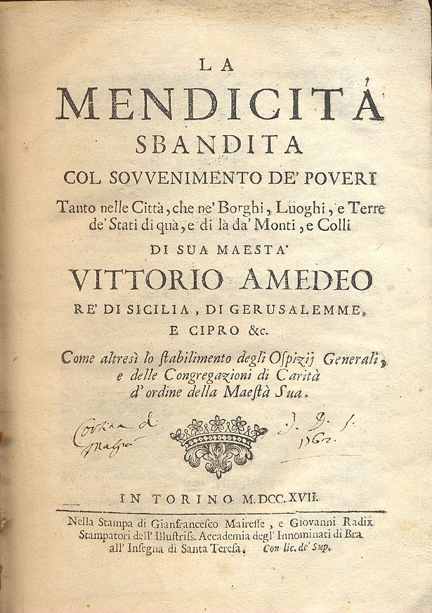 La mendicità sbandita col sovvenimento de' poveri. Tanto nelle città, che ne' borghi, luoghi e terre de' Stai di quà e di là da' monti e colli di Sua Maestà Vittorio Amedeo.