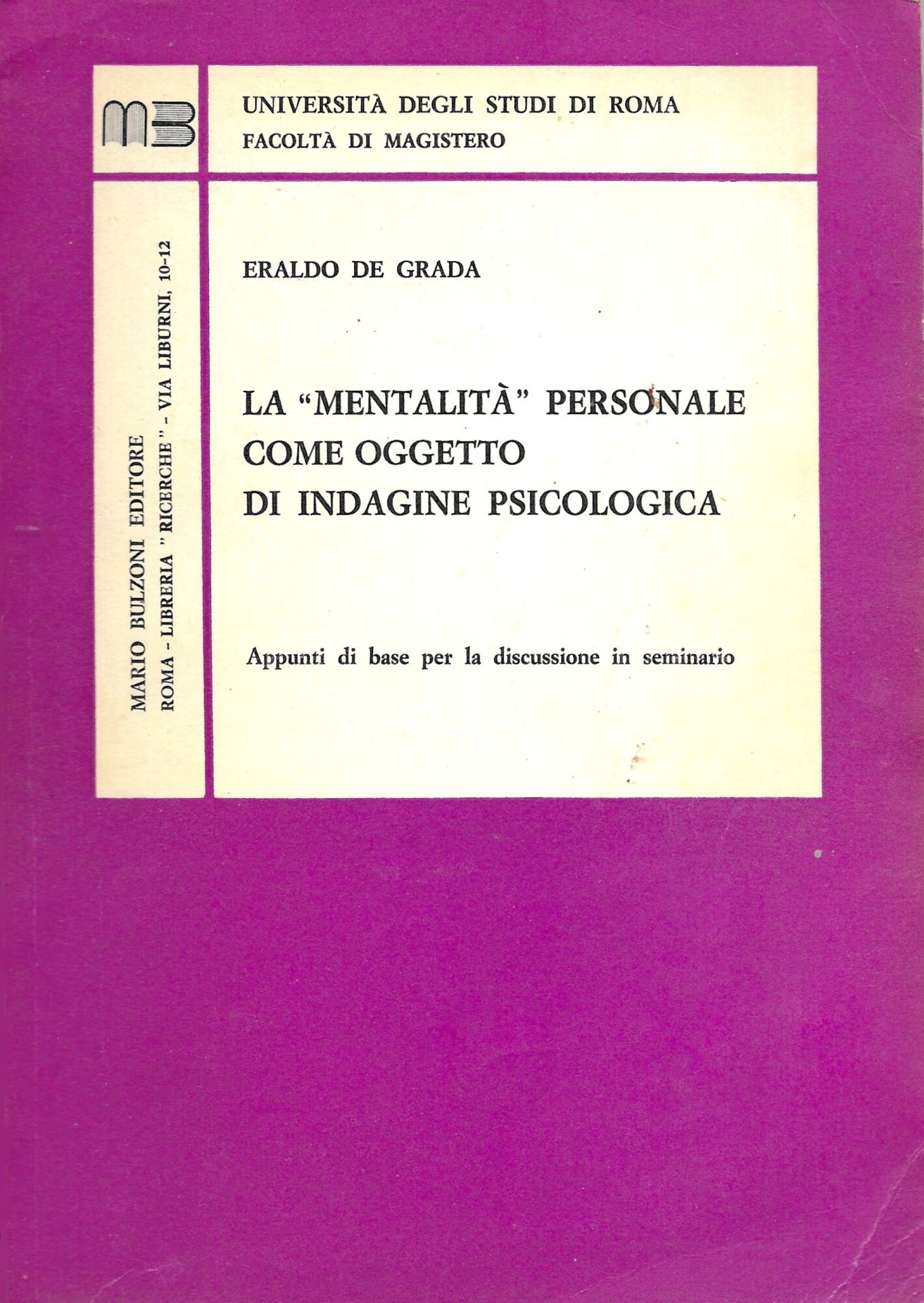 La " Mentalità " personale come oggetto di indagine psicologica | Libri antichi e moderni | ERALDO DE GRADA, ,ERALDO DE GRADA
