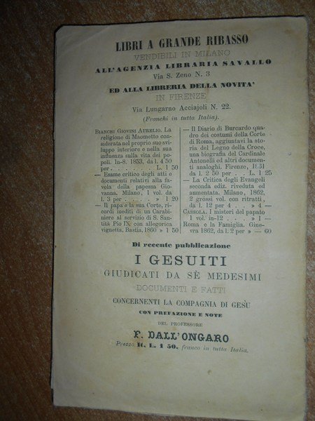 di Giovanni Fisiofilo. Bologna, Agenzia-Giornalistica-Libraria Foschini, 1865. La Monacologia ossia descrizione metodica de' Frati di Giovanni Fisiofilo 800. Dalla latina nell' italiana favella recata da CARLO BOTTA. Nuova edizione con varie aggiunre. In 16°, br. orig. 84 pp., testo in latino e, a fronte, in italiano. Ottimo es. corredato da 6 tavv. litografiche f.t. contenenti 43 figg. di abiti, capi con tosura, cappucci, veli da suore, cordigli, scarpe e altra parti di indumenti di vari ordini monastici. Rappresentazione, in chiave satirica, sulla vita dei frati; nell'opera sono ferocemente attaccati Domenicani, Francescani, Cappuccini, Agostiniani, Serviti, Carmelitani. Strappo angolare alla brossura, interno ottimo. Neg. scat. 2 opuscoli nonn.