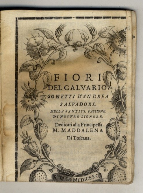 La natura al presepe, panegirico sacro. Recitato all'altezze sereniss. di Toscana il giorno del Santissimo Natale, Fiori del Calvario, sonetti del medesimo nella Santiss. Passione. In fine: In Fiorenza, per Pietro Cecconcelli, 1623, pp. (8), 57. (Pubblicato con:) Salvadori Andrea. Fiori del Calvario, (In Fiorenza, per Pietro Cecconcelli, 1623), pp. (8), 60, (4).