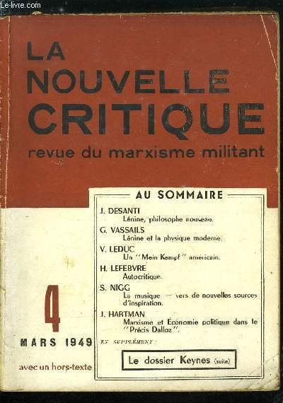 La nouvelle critique n� 4 - Lenine, philosophe nouveau par Jean Desanti, Lenine et la physique moderne par G�rard Vassails, Autocritique : contribution a l'effort d'�claircissement id�ologique par Henri Lefebvre, Un Mein Kampf americain par Victor Leduc