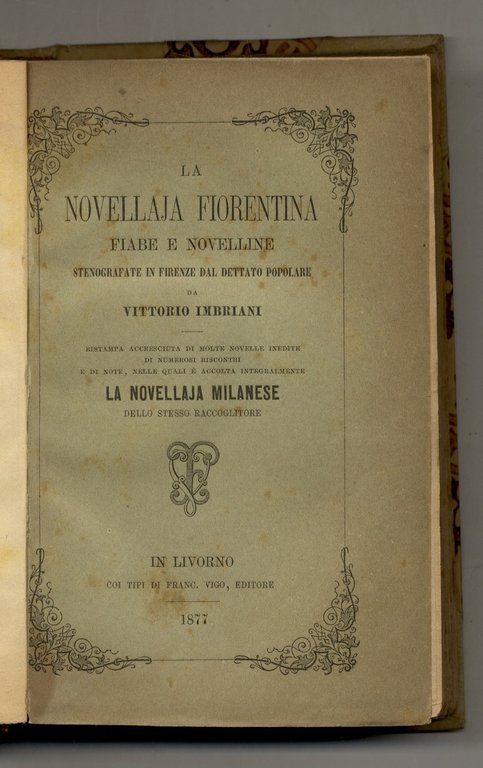 La novellaja fiorentina. Fiabe e novelline stenografate in Firenze dal dettato popolare da Vittorio Imbriani. Ristampa accresciuta di molte novelle inedite, di numerosi riscontri e di note, nelle quali è accolta integralmente La novellaja milanese, dello stesso raccoglitore. | Libri antichi e moderni | Imbriani Vittorio [].