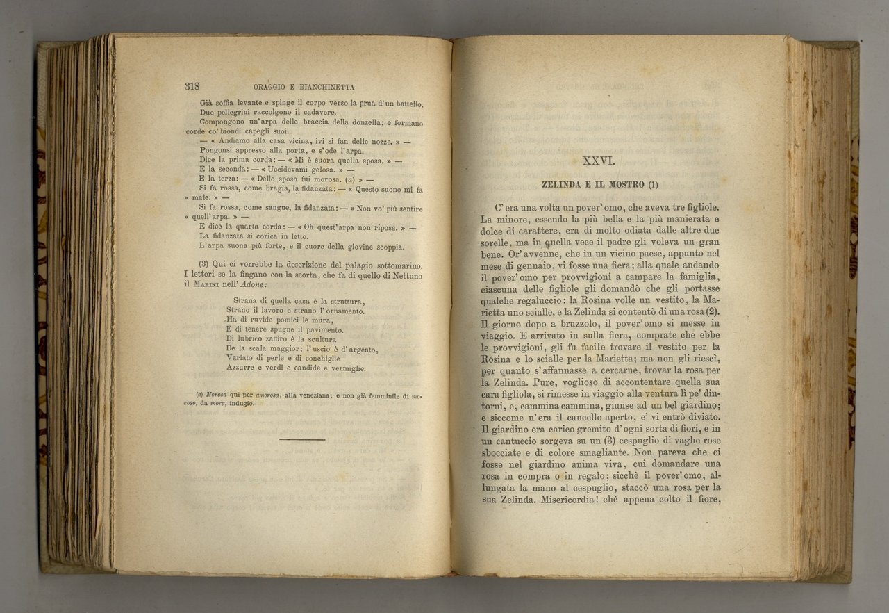 In Livorno, coi tipi di Francesco Vigo, 1877, in-8, legatura novecentesca in mezza pergamena con punte, titolo in oro su tassello in pelle al dorso, conservate all'interno le copertine della brossura editoriale, pp. XV, [1], 640. Edizione definitiva di questa raccolta di favole popolari. Bell'esemplare.
