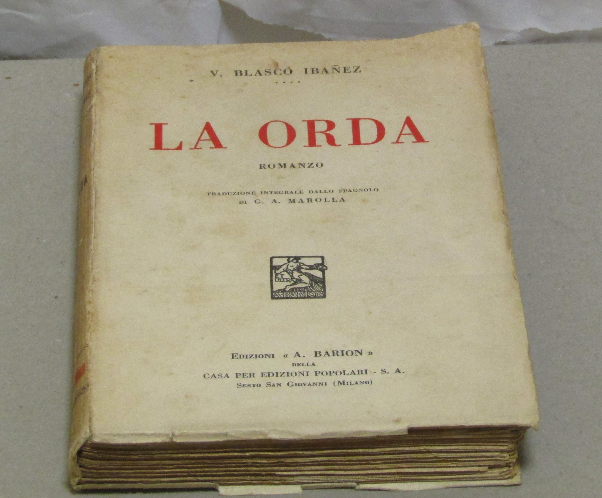 V. BLASCO IBANEZ LA ORDA Traduzione integrale dallo Spagnolo di G.A. MAROLLA . MILANO, BARION 1933 , In-16 - bross. edit. a stampa (originale) - pp. 383 - in barbe - BUON EX