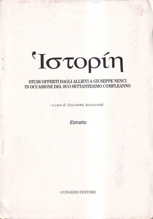 Volume spillato estratto dall'opera Iotopin, studio offerti dagli allievi a Giuseppe Nenci in occasione del suo settantesimo compleanno. Piatti leggermente macchiati. Pagina ben salde alla cerniera, con ampio margine, ingiallite. Numero pagine 11.