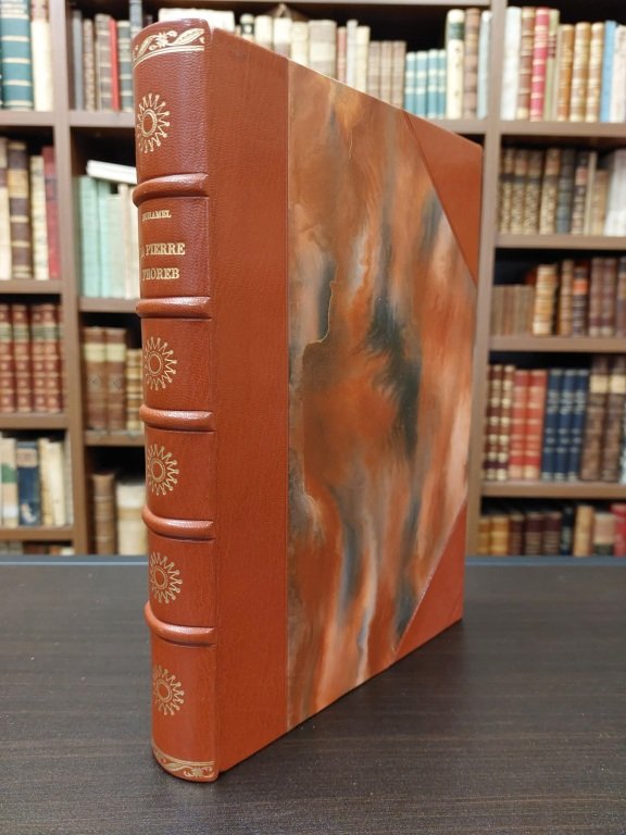 <span style="font-style: normal;">In-8° (cm. 25,5), legatura in mezza pelle e angoli, dorso a nervi con titolo e impressioni in oro, piatti marmorizzati con taglio superiore dorato; pp. [2b] 229 [15] in barbe, in ottimo stato. Conservata la brossura originale crema con titolo in rosso e in nero. 31 silografie colorate a camaïeu a tre toni intercalate n.t. di Paul Émile Colin, 19 culs-de-lampe disegnati dallo stesso Colin. Esemplare n. 132 di 396 impresso </span><i>sur vélin à la forme des Papetieres d'Arches fabriqué spécialement</i>. Condizioni perfette, conservato in custodia marmorizzata. (NC7)