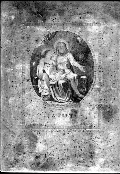 Gestochene Kupferplatte (120:169 mm). Schön gestochene Darstellung Mariens als Mater Dolorosa mit dem Leichnam des vom Kreuze abgenommenen Christus. Der Reproduktionsstecher Petrini (geb. um 1750) war bis 1810 in Rom tätig (vgl. Thieme/B. 26, 500 u. Nagler 11, 188). Als Schöpfer der Vorzeichnung wird "L. Agricola" genannt (d. i. Luigi Agricola, Vater des Historienmalers Filippo Agricola?). Mit Druckervermerk: "In Roma presso Agapito Franzetti al Corso".