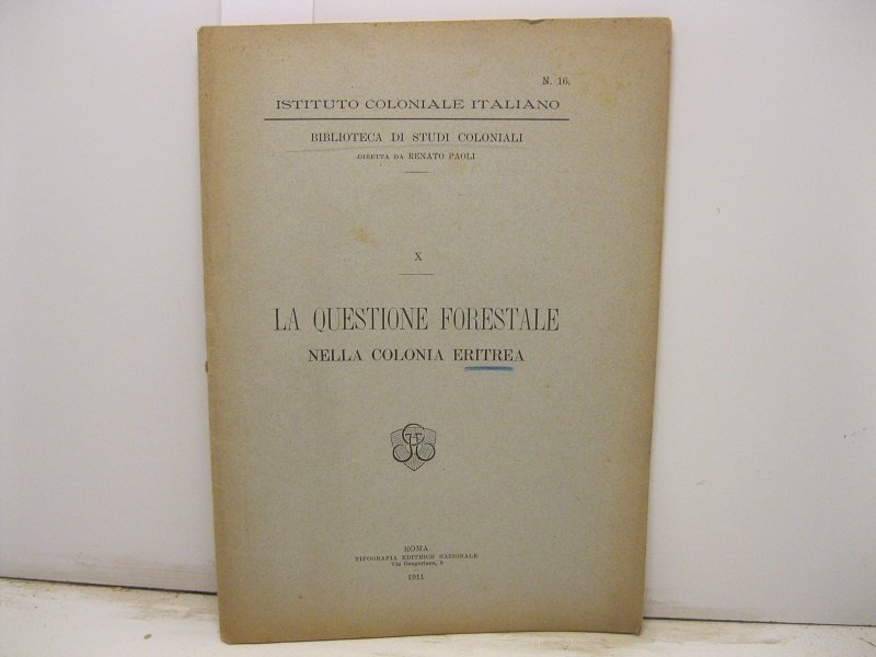 In 8, pp. 54. Br. ed. Saggio inserito nella collana di Studi coloniali diretta da Renato Paoli. Saggio relativo alle cause che produssero il diboscamento dell'Eritrea, ai provvedimenti legislativi presi dal governo africano, e ad un piano di riboschimento. Fra le cause del massiccio diboscamento, lo sfruttamento minerario del paese che ebbe sull'ambiente un impatto devastante.