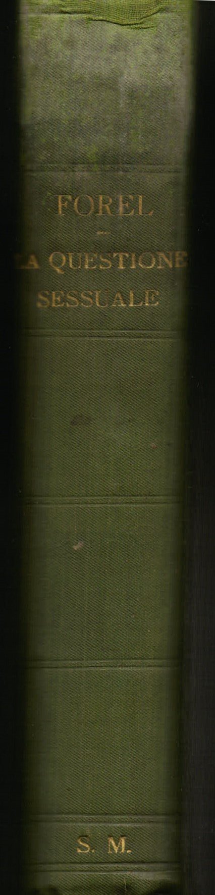 In-8°, pp. 535, mezza tela verde coeva con titolo in oro al dorso. Una tav. a colori su doppia pagina con raffigurazioni in litografia a colori di cellule sessuali maschili e femminili illustrative della fecondazione. Svariate illustrazioni xilografiche n.t. Lievi sbiaditure alla tela. Buon esemplare. Prima edizione italiana, vol. n. 34 della 'Biblioteca di Scienze Moderne Bocca', di questo vasto saggio affrontante ogni possibile questione legata alla sessualità. Il Forel (Morge, 1848-Yorne,1931) fu un celebre psicologo, biologo ed entomologo, professore di psichiatria all'Unversità di Zurigo, nonché riformatore sociale di notevole peso; fu lui a far approvare, ad esempio, la prima legislazione svizzera sulle sterilizzazioni. Le sue opere furono tra l'altro attentamente lette da Freud, che recensì il suo volume sull'ipnotismo.
