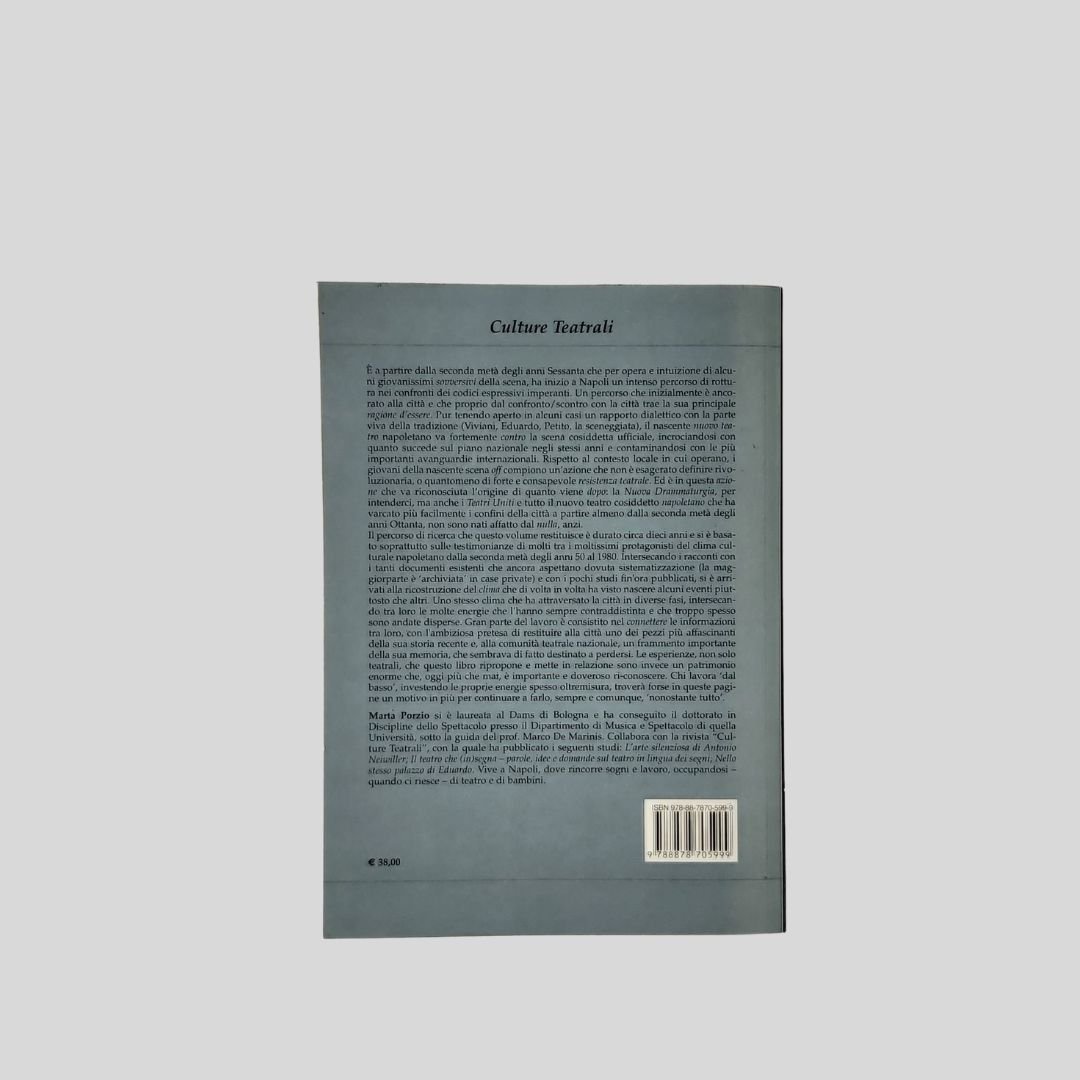 In-8 (cm 21,5), pp. 500, ill. fotogr. Insignificanti tracce d’uso, manca la prima carta bianca, ma in buone condizioni. Un libro insostituibile per la conoscenza del teatro di ricerca partito da Napoli. «È a partire dalla seconda metà degli anni Sessanta che per opera e intuizione di alcuni giovanissimi sovversivi della scena, ha inizio a Napoli un intenso percorso di rottura nei confronti dei codici espressivi imperanti. Un percorso che inizialmente è ancorato alla città e che proprio dal confronto/scontro con la città trae la sua principale ragione d’essere. Pur tenendo aperto in alcuni casi un rapporto dialettico con la parte viva della tradizione (Viviani, Eduardo, Petito, la sceneggiata), il nascente nuovo teatro napoletano va fortemente contro la scena cosiddetta ufficiale, incrociandosi con quanto succede sul piano nazionale negli stessi anni e contaminandosi con le più importanti avanguardie internazionali. Rispetto al contesto locale in cui operano, i giovani della nascente scena off compiono un’azione che non è esagerato definire rivoluzionaria, o quantomeno di forte e consapevole resistenza teatrale. Ed è in questa azione che va riconosciuta l’origine di quanto viene dopo: la Nuova Drammaturgia, per intenderci, ma anche i Teatri Uniti e tutto il nuovo teatro cosiddetto napoletano che ha varcato più facilmente i confini della città a partire almeno dalla seconda metà degli anni Ottanta, non sono nati affatto dal nulla, anzi. Il percorso di ricerca che questo volume restituisce è durato circa dieci anni e si è basato soprattutto sulle testimonianze di molti tra i moltissimi protagonisti. Il libro parte dagli anni ’50 (data simbolica, l’anno della morte di Raffaele Viviani) e si chiude con gli anni ’80 (ancora una data simbolica, con il terremoto che sconquassa la città). La forza del tomo è la capacità di calare il teatro in quel contesto sociale, politico ed economico. Per anni la ricerca teatrale a Napoli è stata considerata ai margini se confrontata con quella di città come Milano o Firenze. Chiudere il volume con il terremoto è anche una scelta stilistica, perchè consente all’autrice di muoversi in una giusta prospettiva storica dove il rapporto con la tradizione è più semplice, sedimentato».